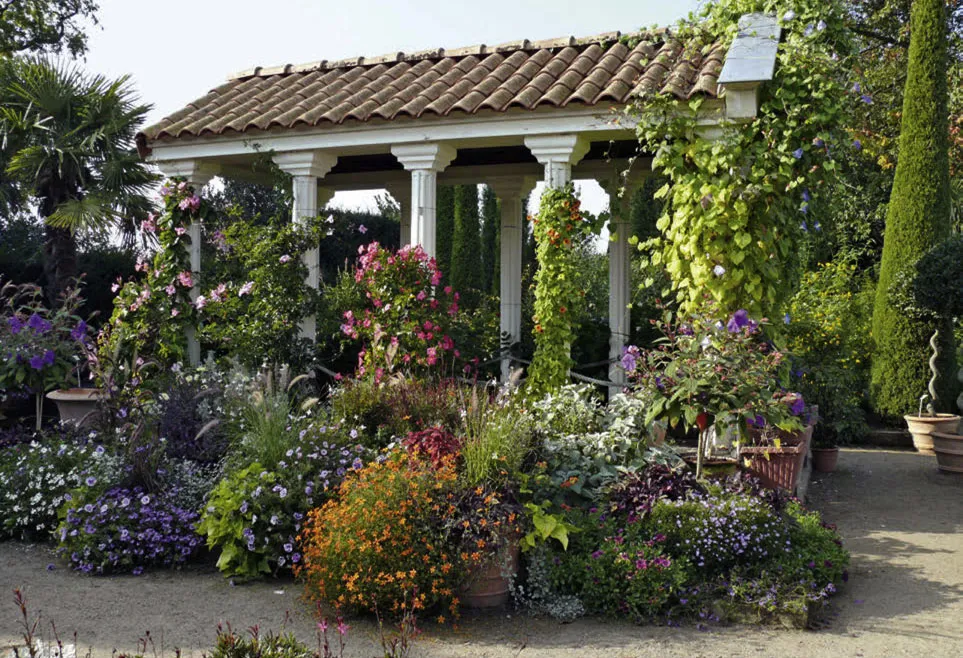 Der italienische Pavillon hat scheinbar Mühe, sich aus dem Blütenmeer der zahlreichen Kübelpflanzen zu recken. Mandevillen (Dipladenia), Blaue Prunkwinde (Ipomoea tricolor), Prinzessinnenblume (Tibouchina urvilleana) und Schwarzäugige Susanne (Thunbergia alata) wetteifern hier um die Gunst der Blicke.