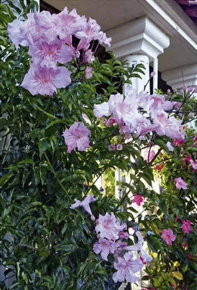 Der Trompetenwein (Podranea ricasoliana) ist eine wenig bekannte, aber sehr dekorative Kletterpflanze, die hier die Säulen umgarnt. Im Kübel gehalten lässt sie sich an hellem Standort frostfrei überwintern.