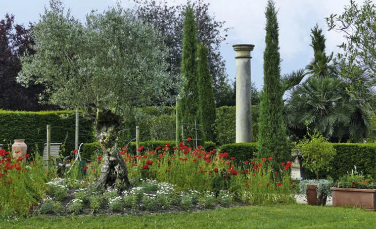 Wer an die Toskana denkt, hat sehr wahrscheinlich eine weite Landschaft mit Zypressen vor Augen. Man muss nicht so weit fahren, denn diese gibt es im Kleinformat auch in der Norddeutschen Gartenschau, im Zauber der Toskana. Ein gemütliches Rondell bietet alles, was das Toskanaherz begehrt. Hier wurden aber keine echten Zypressen (Cupressus) gepflanzt, die nicht winterhart sind, sondern Ersatzgehölze wie der säulenförmige Wacholder Juniperus chinensis ‘Spartan'.