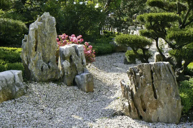 Symbolisierte Berge und Flüsse aus Findlingen und Kieselsteinen sind typische Elemente fernöstlicher Gärten. Hans-Dieter Warda hat diese Formationen detailliert und punktgenau errichten lassen.