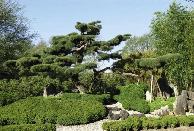 In einer Großaktion hat Hans-Dieter Warda zwei besonders malerisch gewachsene Kiefern (Pinus sylvestris) von einer norddeutschen Pferdeweide kurz vor dem Fällen gerettet, umgepflanzt, in langwieriger und mühevoller Arbeit in der Norddeutschen Gartenschau etabliert und in Form geschnitten. Mittlerweile haben sie ein Alter von etwa 100 Jahren.