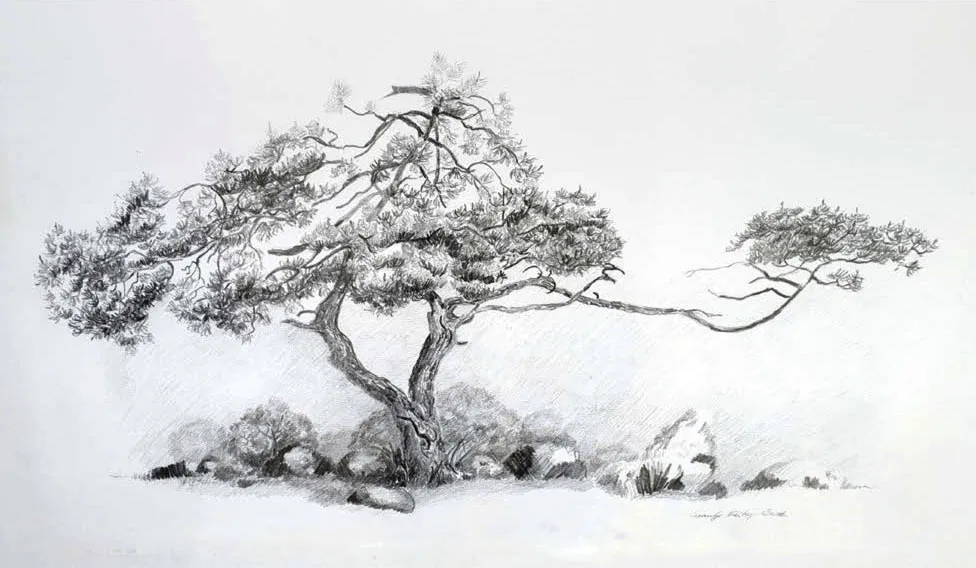 Swantje Warda zeichnete die oben abgebildete Kiefer am Standort auf der Weide einen Tag vor dem Herausnehmen (Bleistift, 2004).
