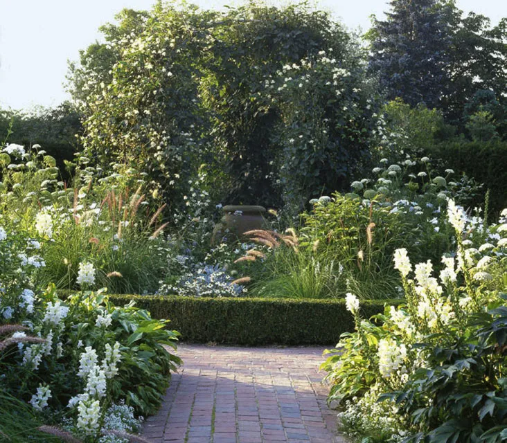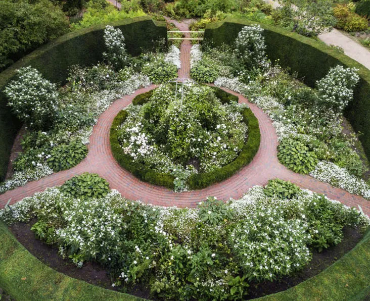 Der Weiße Garten ist kreisrund angelegt und wird von einer hohen Eibenschnitthecke eingefasst. Er ist edel und klar in seiner Wirkung. Im Sommer dienen sechs hohe Argentinische Nachtschatten (Solanum bonariense) der Gliederung und vertikalen Betonung des Weißen Gartens.