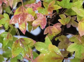 Laub: Sommergrün. Kleinformatiges, grünes, dreilappiges Laub. Schönes herbstliches Farbenspiel von Gelborange bis Weinrot.
