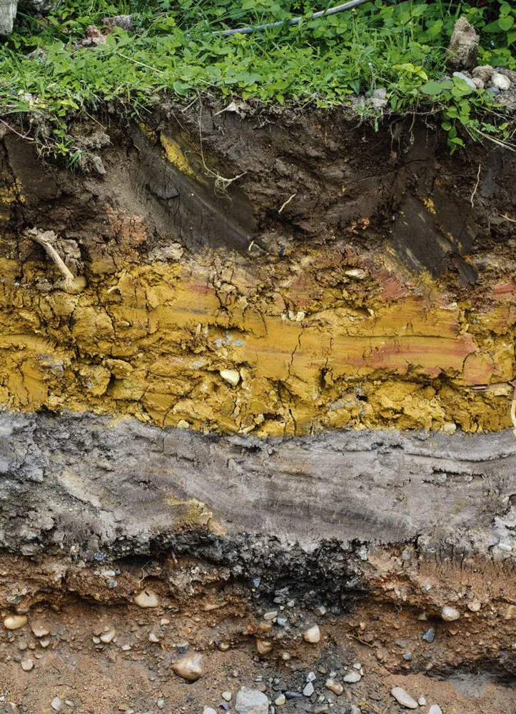 Unterschiedliche Bodenhorizonte bzw. Bodenschichten sind deutlich erkennbar: Humus-, Lehm- und Tonschichten im Profil.