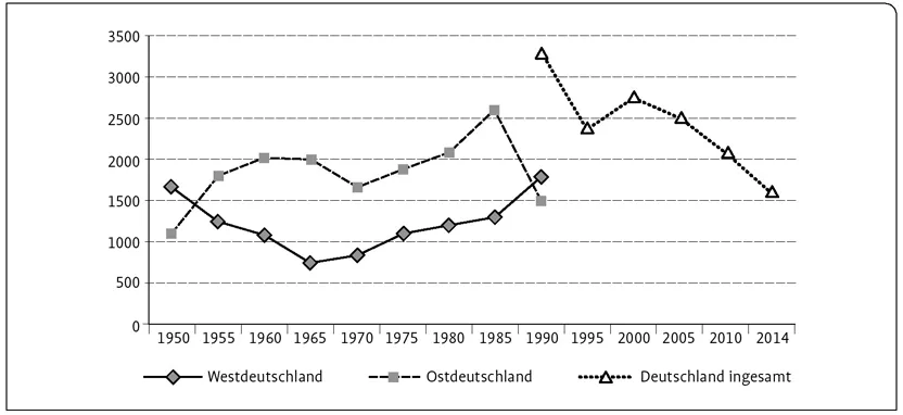 In der Nachkriegszeit nahm die Entwicklung der Schafbestände in Westdeutschland und der ehemaligen DDR einen unterschiedlichen Verlauf (Abb. 1). In Westdeutschland gingen die Schafzahlen zurück, da sich aufgrund der weiter fallenden Wollpreise die Einkommenslage der Schafhaltung erheblich verschlechtert hatte. Mitte der 60er-Jahre wurde ein Tiefstand von nur noch 700 000 Schafen erreicht. Mit der Neuausrichtung der Schafhaltung auf das Produktionsziel Lammfleischerzeugung erholte sich der westdeutsche Schafbestand wieder allmählich, sodass 1990 ein Bestand von 1,7 Mio. Schafen gezählt wurde. Unterstützt wurde diese Entwicklung durch die 1980 eingeführte EG-Marktordnung für Schaffleisch und die damit verbundene Mutterschafprämie sowie die zunehmende Verbreitung der Koppelschafhaltung, die der Schafhaltung auch im Nebenerwerb beste Möglichkeiten bot.