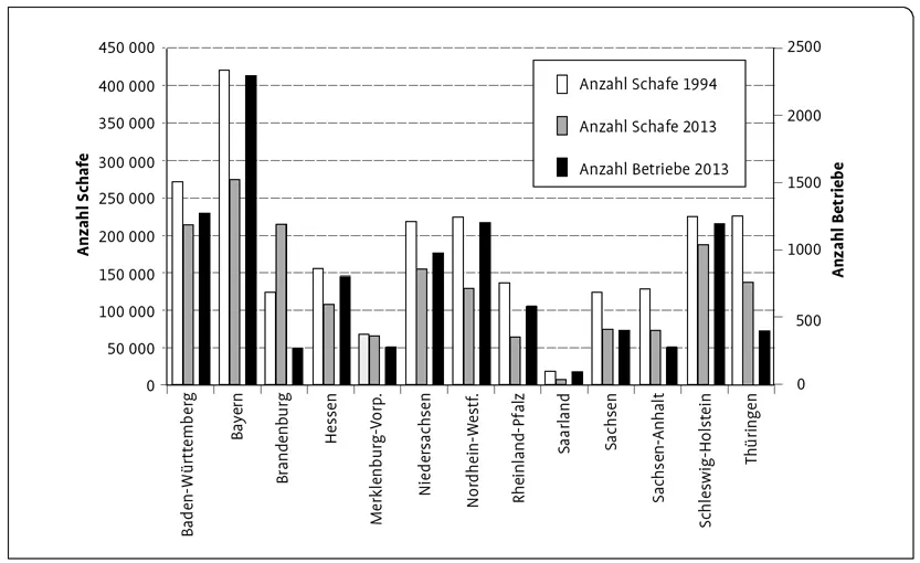 Insgesamt werden heute (2014) in Deutschland 1,6 Mio. Schafe von 10 100 Betrieben gehalten (Statistisches Bundesamt 2014). Dabei sind gemäß Viehzählung jedoch nur die Betriebe mit mehr als 20 Schafen bzw. 2 ha landwirtschaftliche Nutzfläche berücksichtigt. Bayern und Baden-Württemberg sind die Länder mit den meisten Schafen und Betrieben (Abb. 2).