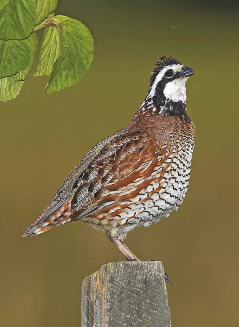 Virginiawachtelhahn in seiner ganzen Pracht. Auf Anhöhen, Pfosten und Felsbrocken sitzt er gerne, um sein Revier zu kontrollieren und seine Revierrufe erschallen zu lassen.