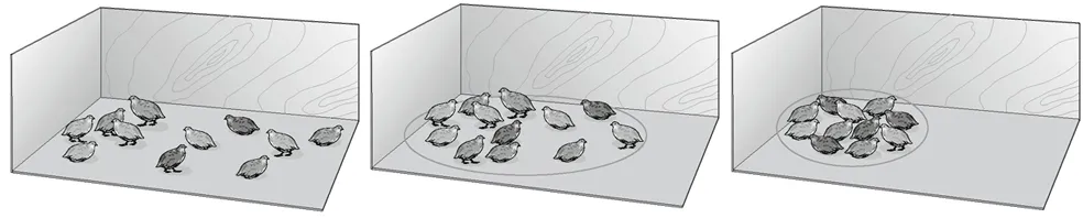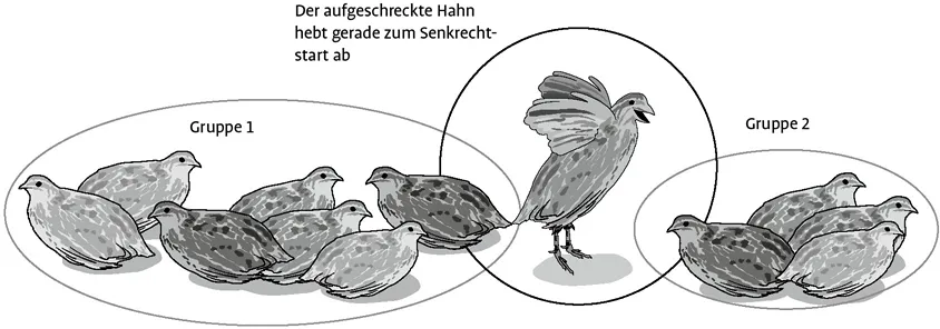 Nachtverhalten der Wachteln. Mit einsetzender Dämmerung sammeln sich die Wachteln auf einer Lichtung, rücken langsam immer dichter zusammen und bilden einen Kreis, in dem ihre Schwänze zum Mittelpunkt ausgerichtet sind. So entsteht eine sternförmige Formation, der sich kein Feind unbemerkt nähern kann.