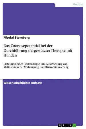 Wissenschaftlicher Aufsatz aus dem Jahr 2016 im Fachbereich Gesundheit - Public Health, Note: 1, 3, St. Elizabeth University of Health & Social Sciences (Universität), Sprache: Deutsch, Abstract: Tiergestützte Therapien stellen eine therapeutische Alternative oder Ergänzung in verschiedenen Bereichen bei der Behandlung von Leid von Patienten dar. Ein Beispiel ist die tiergestützte Therapie bei demenzkranken Menschen. Hierbei werden vor allem Hunde (aber auch Katzen, Reptilien oder Ziergeflügel sind möglich) für eine Therapie mit den Patienten eingesetzt und finden auch Zugang in die Einrichtungen z.B. von Altersheimen. Im Rahmen dieser Arbeit soll auf mögliche Probleme im Bereich Hygiene und somit auf Zoonosen eingegangen werden. Dabei wird eine fundierte Risiko- und Gefahrenanalyse durchgeführt um dann als Folge Maßnahmen zu deren Verringerung oder Vermeidung vorzuschlagen.Beim Zusammentreffen von Menschen mit Tieren oder auch Tierprodukten sei es im Beruf oder in der Freizeit ist auch immer ein Zoonoserisiko zu beachten. Wichtig ist eine fachlich fundierte Risiko- und Gefahrenanalyse durchzuführen um dann als Folge Maßnahmen zu deren Verringerung oder Vermeidung durchzuführen. Im Beispiel der tiergestützten Therapie bei demenzkranken Menschen werden ältere Patienten mit Tieren, zusammengebracht und kommen so mit diesen in räumlichen Kontakt.