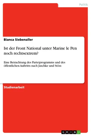 Studienarbeit aus dem Jahr 2015 im Fachbereich Politik - Thema: Europäische Union, Note: 2, 7, Rheinische Friedrich-Wilhelms-Universität Bonn, Veranstaltung: Politischer Extremismus im demokratischen Verfassungsstaat, Sprache: Deutsch, Abstract: Diese Arbeit untersucht die Fragestellung, ob der Front National (FN) nach der Definition von Jaschke nach der aktuellen Kampagne Marine le Pens rechtsextrem ist und welchem Parteityp nach Stöss der FN zugeordnet werden kann. Anhand ausgewählter Beispiele werden Programmatik und öffentlicher Auftritt der Partei auf rechtsextreme Inhalte untersucht. Nicht im Interesse dieser Ausarbeitung liegt die vollständige Untersuchung des Parteiprogramms oder des öffentlichen Auftritts des FN, sondern nur der für die Analyse relevanten Programmpunkte. Zu Beginn, in Kapitel 2, wird die Geschichte des FN kurz umrissen. In Kapitel 3 wird die Basis der Analyse mit den Begriffsdefinitionen nach Jaschke und Stöss gelegt, um schließlich in die Analyse des Parteiprogramms in Kapitel 4 einzusteigen. Einige ausgewählte öffentliche Auftritte aus den Jahren 2011 bis 2015 von Parteimitgliedern des FN werden im Kapitel 5 unter die Lupe genommen. Abschließend folgt ein Fazit.Im Mai 2014 erlangte der Front National unter der Führung Marine le Pens 24, 86% der Stimmen bei der Europawahl und wurde somit stärkste Partei, während die etablierte Union Pour Un Mouvement Populaire (UMP) unter Sarkozy mit 20, 81% und die Parti Socialiste (PS) des amtierenden Präsidenten Francois Hollandes mit 13, 98% geschlagen wurden. Erstmals bekommt die Partei die Möglichkeit, eine Fraktion mit anderen rechten Parteien im Europaparlament zu formen. Die Fraktion nennt sich Europa der Nationen und der Freiheit mit 38 Sitzen. Durch die entstandene Fraktion erhalten die Parteien, darunter auch der FN, Gelder in Höhe von 17, 5 Mio. Euro, Einfluss in Ausschüssen und Medienpräsenz. Mit diesem Ergebnis feiert Marine le Pen einen der größten Erfolge in der Parteigeschichte. Parteigründer Jean-Marie le Pen, der dem rechtsextremen Lager angehört und sowohl für antisemitische Äußerungen als auch für die Verharmlosungen des Holocaust bekannt ist, gab im Januar 2011 den Parteivorsitz an seine Tochter Marine le Pen ab. Bevor sie den Parteivorsitz übernahm, verfolgte die Partei einen rechtsextremen Kurs. Seit dem Amtswechsel vollzieht der FN einen Wandel, in dem er sich als "weder rechts noch links" präsentiert und offensichtlich rechtsextreme Inhalte aus dem Parteiprogramm verbannt.