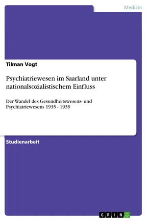 Studienarbeit aus dem Jahr 2017 im Fachbereich Medizin - Geschichte, Note: 1.7, Universität des Saarlandes (Philosophisches Institut), Veranstaltung: Proseminar: Geschichte der Neuzeit, Sprache: Deutsch, Abstract: Mein besonderes Interesse gilt der Psychiatrie und stationär behandelten Patienten nach der Rückgliederung des Saarlandes an das deutsche Reich zwischen 1935 bis zur Schließung der saarländischen Anstalten zu Kriegsbeginn im Jahr 1939. Bedeutend für die regionalgeschichtliche Erforschung dieser Thematik und meiner Quellenerschließung ist die Dissertation "Zwangssterilisation und >Euthanasie< im Saarland 1933 – 1945" des Historikers Dr. Christoph Braß. Eine wichtige Quelle ist das Werk von Adolf Hitler "Mein Kampf", außerdem Publikationen der Ärztin Dr. Gisela Tascher. Für ein besseres Verständnis der Dynamisierung im Psychiatriewesen vor 1935 widme ich mich zunächst der Gründungsgeschichte der Psychiatrieanstalten des Saargebietes und ausführlich der Rassenhygiene im Nationalsozialismus sowie ihrem Ursprung. Im Hauptteil wird dahin gehend der Einfluss des NS-Regimes auf das Gesundheitswesen und die Dynamisierung in der Psychiatrie erörtert. Abschließend folgt eine Zusammenfassung des Sachverhaltes.