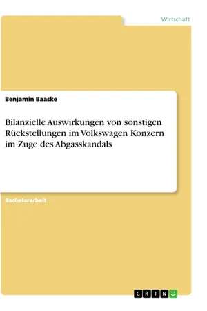 Bachelorarbeit aus dem Jahr 2019 im Fachbereich BWL - Rechnungswesen, Bilanzierung, Steuern, Note: 1, 3, Technische Hochschule Wildau, ehem. Technische Fachhochschule Wildau, Sprache: Deutsch, Abstract: In der vorliegenden Bachelorarbeit wird der Bilanzposten Rückstellungen erläutert. Dabei wird ein besonderes Augenmerk auf die Bilanzierung von Rückstellungen im Zuge des Volkswagen Konzernabschlusses nach International Financial Reporting Standards gelegt. Im weiteren Verlauf der Arbeit wird der DAX-30 Konzern Volkswagen untersucht. Hier werden besonders die sonstigen Rückstellungen analysiert, da diese im Abgasskandal zu erheblichen Sondereffekten geführt haben. Der Konzern wird über einen sechsjährigen Zeitraum von 2013 bis 2018 betrachtet. Der Untersuchungsschwerpunkt liegt dabei auf dem Ansatz, der Bewertung und dem Ausweis von vorher spezifizierten sonstigen Rückstellungsarten. Um die Untersuchung zu stützen, werden Unternehmenskennzahlen aus der Gewinn- und Verlustrechnung und der Bilanz herangezogen. Diese Kennzahlen sollen mögliche Ermessensspielräume in der IFRS Rechnungslegung verdeutlichen.