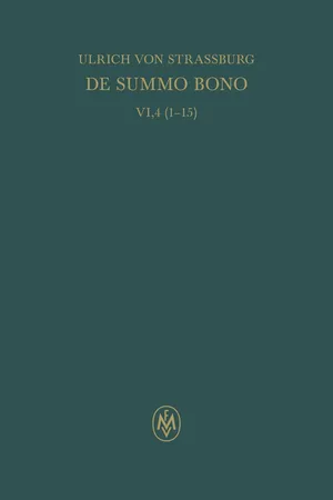 Mit diesem zwölften der kritischen Edition von De summo bono gewidmeten Band nähert sich das Publikationsvorhaben von Ulrichs Meisterwerk seinem Abschluss. Der Band enthält die ersten 15 Kapitel des vierten Traktats: De iustitia.
