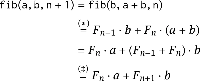 fib(0, 1, n) die Zahl F n. In der Tat gibt der Aufruf fib(0, 1, 0) den Wert 0 = F0, der Aufruf fib(0, 1, 1) = fib(1, 1, 0) = 1 gibt also 1 = F1 zurück. Wir behaupten, dass for n ≥ 1 der Aufruf fib(a, b, n) den Wert Fn−1 ⋅a+Fn ⋅b ergibt. Für n = 1 sehen wir fib(a, b, 1) = fib(b, a+b, 0) = b,wegen b = F0⋅a+F1 ⋅b ist die Vermutung also für n = 1 bewiesen. Sehen wir uns an, was im Induktionsschritt geschieht. Wir nehmen also an, dass die Behauptung für den Wert n ≥ 1 bewiesen ist, und rechnen aus