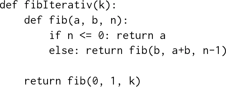 if eingeleitete Abfrage, ob das dritte Argument negativ oder null ist. Diese Abfrage wird durch einen Doppelpunkt, der auf die Bedingung folgt, abgeschlossen, hierauf folgt ein Block, in dem die entsprechende Aktion spezifiziert wird. In diesem Fall handelt es sich darum, den Wert des ersten Arguments zurückzugeben, was durch das Schlüsselwort return angedeutet wird. Dieser Block wird dann verlassen, um die Alternativen zu erkunden, die in diesem Fall durch das Schlüsselwort else angedeutet werden, hierauf folgt wieder ein Doppelpunkt, auf den ein Block folgt, der hier ebenfalls den Rückgabewert für die Funktion angibt, wobei die Parameter geeignet modifiziert werden.Wenn wir uns die zweite Funktion ansehen, so stellen wir fest, dass der definierende Block dieser Funktion, der äußeren, eine lokale Funktion enthält (nämlich die, die wir gerade definiert haben), der Rückgabewert der äußeren Funktion ist gerade ein Aufruf der lokalen Funktion, der den obigen Überlegungen zur Korrektheit entspricht. Dieser Rückgabewert wird wieder durch das Schlüsselwort