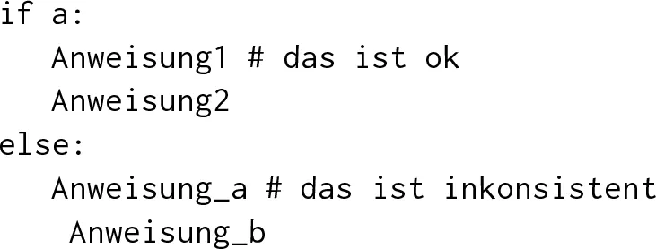 def eingeleitet, dann folgt der Name der Funktion und, in Klammern, eine Parameterliste, die auch leer sein kann. In der Tat ist es so, dass jede Funktion eine Parameterliste mitbekommt: Auch wenn sie leer ist, muss sie notiert werden. In unserem Beispiel ist die Liste der Parameter eine durch Kommata abgetrennte Liste von Namen; im Gegensatz zu anderen populären Sprachen (Java, C, C++) benötigen wir keine Typangaben für die Parameter. Auf die schließende Klammer folgt ein Doppelpunkt, auf den der definierende Block der Funktion folgt.Sie sehen, dass der Block eingerückt ist. Alle folgenden Anweisungen, die dieselbe oder eine größere Tiefe der Einrückung aufweisen, gehören zu diesem Block. Wir werden gleich sehen, dass Blöcke auch geschachtelt werden können, dadurch wird auch optisch klar, welche Anweisungen zu diesem Block gehören. Die Anzahl der Leerzeichen zur Definition eines Blocks ist beliebig. In der Regel findet man Einrückungen von sechs Leerzeichen, man muss ein wenig vorsichtig sein, weil manche Editoren das Einrücken durch das Setzen der Tabulatortaste bewerkstelligen. Das führt leicht zu Irritationen, die sich jedoch durch die Einstellungen beim Editor beseitigen lassen. Die Einrückung muss konsistent sein: