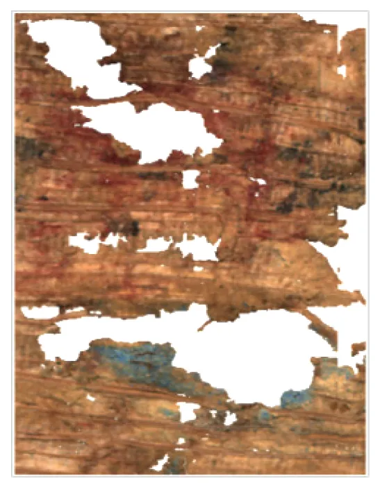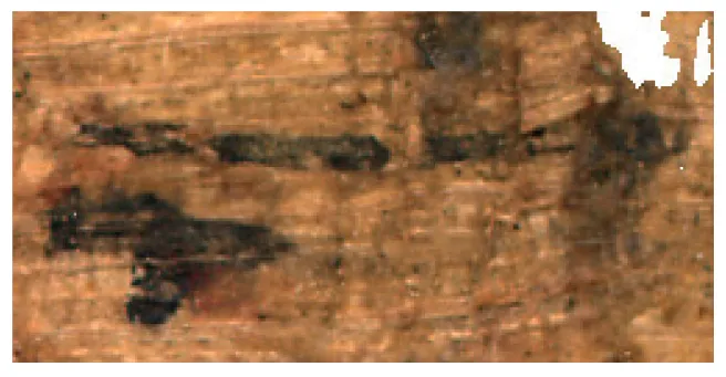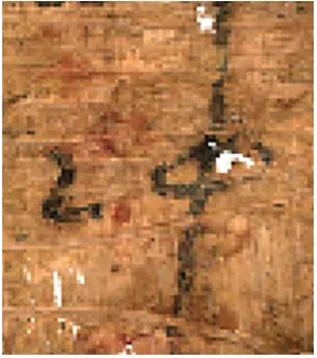 Die Aktenrolle P.Trier II 15 stammt aus Mumienkartonage1 und weist an diversen Stellen Farbreste der ursprünglichen Bemalung auf. Als Beispiel soll hier ein Ausschnitt aus dem unteren Teil der ersten Kolumne (Abb.1) dienen, auf dem Spuren von roter und blauer Farbe zu erkennen sind. In diesem Bereich ist zudem die Tinte verlaufen, was wohl während des Auflösens der Kartonage geschehen ist und irreversible Schäden an der Beschriftung des Papyrus hervorgerufen hat, besonders am Ende der ersten Kolumne, sodass der Inhalt des Schriftstücks (e) nicht rekonstruiert werden kann.