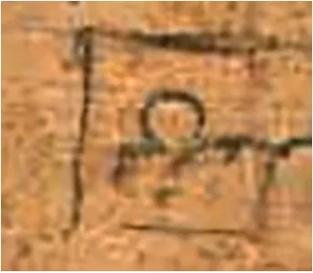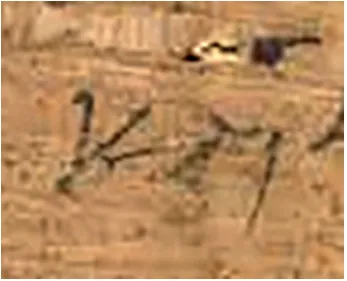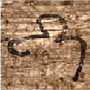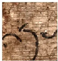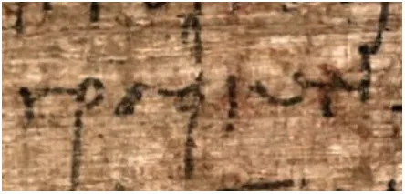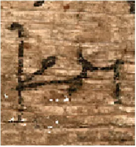 Auf Abkürzungen verzichtet der Schreiber weitestgehend. Lediglich das Drachmenzeichen wird mit dem typischen Häkchen abgekürzt (siehe Abb. 10). Dort, wo im Papyrus die Weizenartaben erwähnt werden (Kol. I 14.16, III 60), die Antiphilos erhält, ist die Tinte so stark abgerieben, dass man die Art der Abkürzung nur an einer Stelle erkennen kann (siehe Abb. 11). Dort ähnelt sie der in der Naukleros-Quittung BGU X 1933, 4 (230 v. Chr.). Vgl. auch Blanchard, Sigles et abbréviations, S. 36.