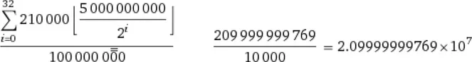 Esto da como resultado el límite de los 21 millones de Bitcoin redondeados (exactamente 20'999'999.9769 BTC302), por lo que los 50 Bitcoin del bloque Génesis no son transferibles303 y otras irregularidades también han dado lugar a Bitcoins no transferibles.304