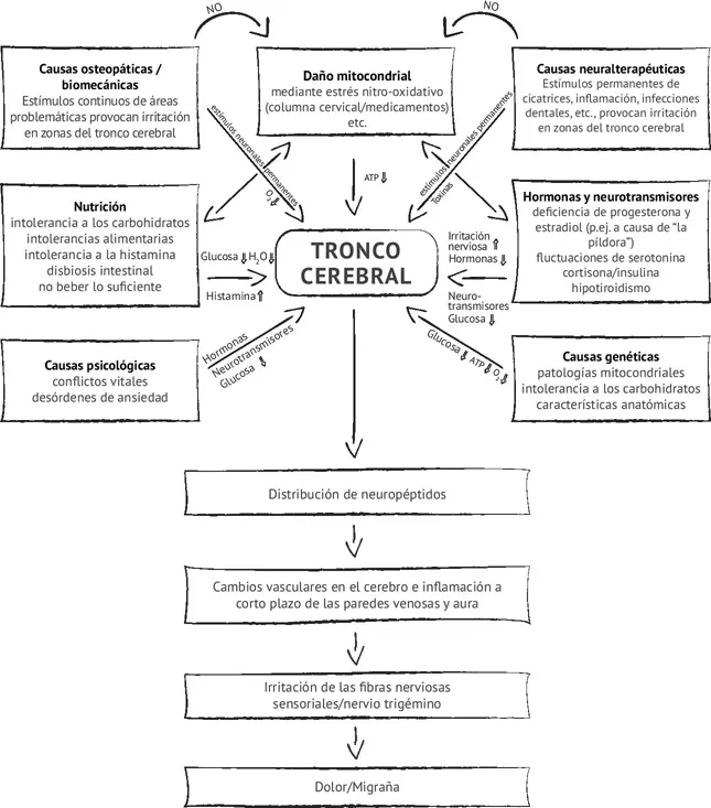 Son numerosos y variados los factores que pueden llevar a una disfunción del abastecimiento en el mitocondrio y a una hiperactividad del generador de migrañas en el tronco cerebral. Allí encontramos también el origen del núcleo de los nervios trigéminos. Posibles factores de sobrecarga son, por ejemplo: mecánicos, químicos, hormonales, relacionados con la alimentación, dependientes de la digestión, dependientes de los sentidos, electromagnéticos, climáticos, infecciosos, psíquicos, tóxicos, inmunológicos, y de naturaleza genética. Pero también, en las terapias neurales, los campos interferentes, como por ejemplo las cicatrices, pueden influir perjudicialmente.