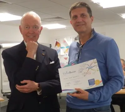 Quince años después me hallaba sentado ante el creador de los mapas mentales, Tony Buzan, en una escuela de negocios de Londres, recibiendo su entrenamiento para poder ser entrenador autorizado por Tony Buzan e impartir el seminario: “Mapas Mentales Practitioner”.