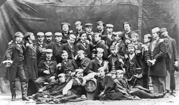 Asociación universitaria Franconia, Bonn, 1864. Nietzsche (en segunda fila, con la mano en la frente), cuando abandone al año siguiente su vinculación con esta hermandad, exclamará: «¡Dioses, qué contento estoy de haberme librado de esa soledad chillona, de esa abundancia vacía, de esa juventud senil!».