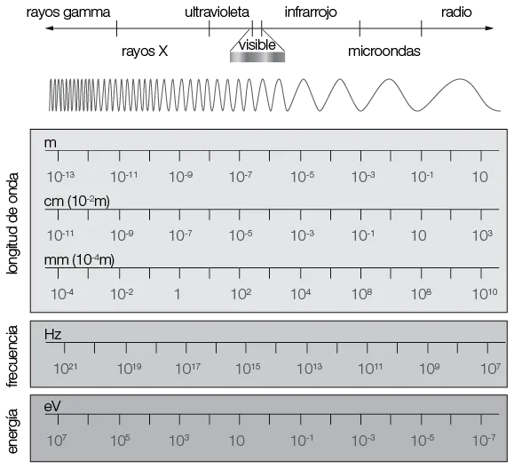 La radio emite con una longitud de onda del orden de un metro, la cena la cocinamos con microondas, el paisaje lo vemos con luz visible, el sol nos broncea con rayos ultravioleta y las radiografías se toman con rayos X. Necesitamos ahora explorar un poco las unidades de la luz, porque cada banda se mide con unidades distintas, algo un poco más complicado que lo que sucede al medir distancias, dado que en casi todo el mundo se utilizan las unidades métricas y unos tres o cuatro países usan las unidades imperiales. Pero a no desesperar, porque la física viene a nuestro rescate.