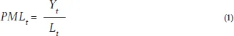 Para poder realizar un diagnóstico respecto a la productividad de la industria minera nacional, esta debe ser cuantificada y analizada mediante métricas establecidas y claramente definidas. En la literatura se destacan dos principales métricas de productividad para una economía o actividad económica. La primera medida es la productividad media laboral (PML), que corresponde al aporte promedio de cada trabajador al valor agregado de la industria. Así, la productividad laboral del sector minero en un año determinado t es igual al cociente entre el valor agregado de la minería en t (Yt) y la cantidad de ocupados (Lt) en el mismo año t. Resulta importante destacar que esta medida de productividad considera que el capital humano (Lt) es el único factor o insumo de producción.