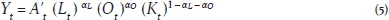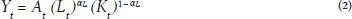 En la Ecuación (2) Yt representa el valor agregado de la producción minera en el año t, At es la PTF del sector minero, Lt el número de empleados mineros y Kt el stock de capital físico en la minería en el año t.