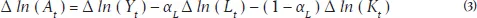 A partir de una linealización de la Ecuación (2) se puede estimar la tasa de crecimiento de la PTF de la industria minera mediante la siguiente expresión: