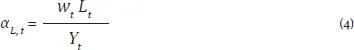 La participación del trabajo (αL) en el valor agregado corresponde a la elasticidad producto-trabajo de la minería. Este parámetro representa el porcentaje de variación del producto minero ante un cambio de 1% en el empleo del sector. La participación del trabajo puede estimarse a partir de la función objetivo de maximización de utilidades de una empresa representativa del sector minero. En específico, mediante las condiciones de primer orden se obtiene que la elasticidad producto-trabajo del sector minero (αL) está dada por el cociente entre la masa salarial y el valor agregado de la misma industria minera. La masa salarial corresponde al producto entre el salario medio (wt) en la minería en t y la cantidad de ocupados (Lt) en el mismo año. Por lo tanto, la participación del trabajo en el valor agregado de la producción minera en el año t está dada por: