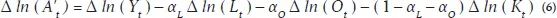 Linealizando la Ecuación (5) de la misma manera que se hizo anteriormente, se puede estimar la tasa de crecimiento de la PTF ajustada por ley del mineral (At’) de manera residual mediante la siguiente ecuación:
