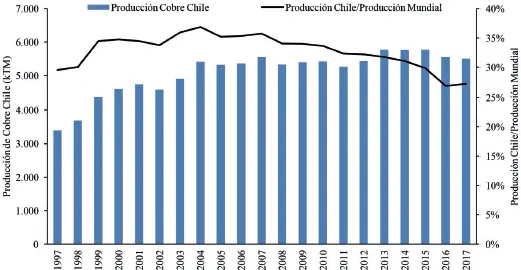 La producción de cobre de mina de Chile el año 1997 fue 3.392 miles de toneladas métricas (kTM). En dicho año, la participación de Chile en la producción mundial de cobre fue 29,6%. En el año 2017, en cambio, la industria del cobre de Chile produjo 5.504 kTM de cobre, representando el 27,2% de la producción mundial de cobre. De esta...