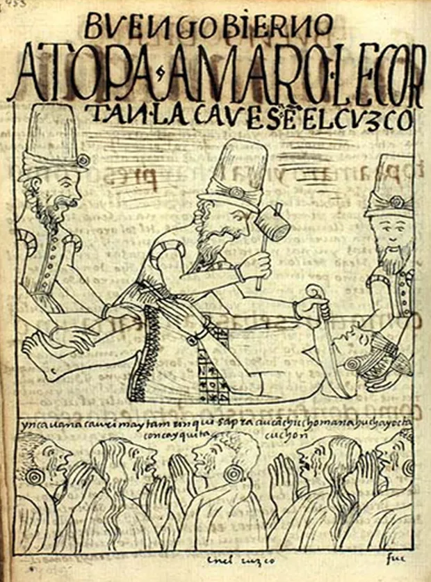 2. Degollación de Túpac Amaru I. Primer nueva corónica y buen gobierno (c. 1615) de Felipe Guaman Poma de Ayala, GkS 2232. 4to. Cortesía de la Biblioteca Real, Copenhague, Dinamarca.