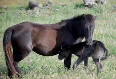 Los potros nacen con un impulso innato de ponerse en pie. Luego buscan dos pilares verticales cubiertos por una sombra oscura. No están buscando nada en concreto: si ven la imagen correcta, meten allí la cabeza. A veces meten la cabeza entre las patas delanteras de la yegua, a veces entre las traseras. En algún momento dan con una mama llena de leche. Moviendo los labios, tarde o temprano se encuentran una teta en la boca y el reflejo de succión se activa. Esta espléndida recompensa da forma al comportamiento de búsqueda, dejando claro que algunos pares de patas tienen pezones y leche mientras que otros no. Después de un par de días han aprendido cuáles son válidos y no cometen más errores.