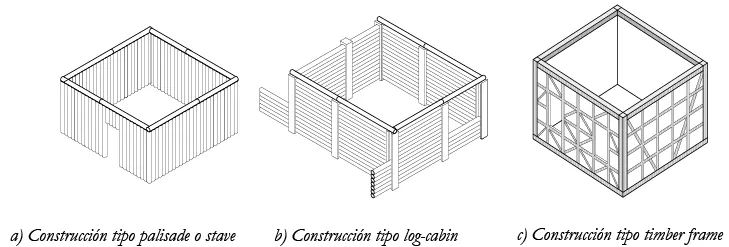 - Timber frame construction, consistente en el uso de pórticos de madera acompañados o no de cercha en cubierta, fueron desarrollados también en Europa a partir del año 5.500-2.500 A.C., ver Figura 1.1.1. Estas construcciones surgieron como una necesidad de disponer de espacios más amplios de almacenamiento agrícola, y pueden ser considerados como los precursores de las estructuras porticadas modernas. Al igual que los tipos precedentes, esta tipología también fue exportada a Norteamérica alrededor del siglo XVII y a día de hoy, se encuentran aproximadamente aún 80 estructuras antiguas en pie de esta tipología.