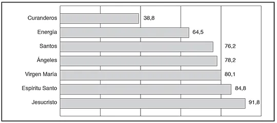 El porcentaje de los que creen en Jesucristo alcanza el 91,8%, sigue la creencia en el Espíritu Santo (84,8% de los casos) y en la Virgen María para el 80,1% de los entrevistados. También se cree en los ángeles (78,2%) y en los santos (76,2%).