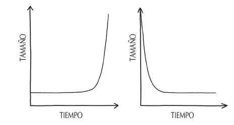 La curva que describe cómo aumenta una cantidad que crece exponencialmente tiene una forma que recuerda a una de las típicas rampas que utilizan los aficionados a hacer piruetas con patines, monopatines o bicicletas BMX. Inicialmente, la pendiente de la rampa es muy suave: la curva es extremadamente poco pronunciada, y solo va ganando altura de una forma muy gradual (como puedes ver en la primera curva de la Figura 2). Al cabo de dos horas hay cuatro células de Strep f. en la leche, y al cabo de cuatro todavía hay solo 16, lo que no parece que represente un gran problema. Sin embargo, al igual que ocurre con la mencionada rampa, luego la altura y la inclinación de la curva exponencial aumentan con rapidez. Al principio, las cantidades que crecen exponencialmente pueden dar la impresión de que aumentan poco a poco, pero de repente despegan de una forma que parece tan abrupta como inesperada. Si te olvidas de la leche durante cuarenta y ocho horas, y el crecimiento exponencial de las células de Strep f. se mantiene, la próxima vez que vuelvas a verterla en tus cereales podría haber casi 1000 billones de células en la botella; suficientes para hacer que se te cuaje la sangre, y no digamos ya la leche. En este punto, las células superarían en número al total de habitantes de nuestro planeta en una proporción de 40 000 a uno. A veces se alude a las curvas exponenciales como «curva en forma de J», ya que su forma se asemeja mucho a la curva pronunciada característica de dicha letra. Obviamente, a medida que las bacterias consumen los nutrientes de la leche y cambian su pH las condiciones de crecimiento se van deteriorando, de manera que el incremento exponencial solo se mantiene durante un período de tiempo relativamente breve. De hecho, en casi todos los escenarios del mundo real el crecimiento exponencial a largo plazo resulta insostenible, y en muchos casos patológico, dado que el sujeto en crecimiento consume recursos de manera inviable. Así, por ejemplo, el crecimiento exponencial sostenido de las células del cuerpo es un rasgo distintivo del cáncer.