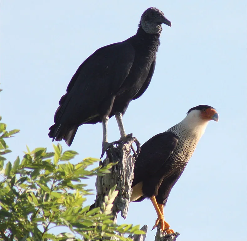Coragyps atratus, zopilote común, con Caracara cheriway, caracara quebrantahuesos. Foto: José Raúl Vázquez.