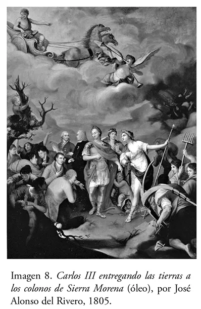 Se ha dicho con frecuencia que la América española fue el laboratorio donde los funcionarios borbónicos ensayaron sus proyectos reformistas. Sin embargo, esto no puede establecerse como una regla general, puesto que hubo casos en los que dichos proyectos se ejecutaron primero en la propia península ibérica para repetirse después (con buena o mala fortuna) en el ámbito americano. Uno de los ejemplos más notables de esto último fue la estrategia de poblar zonas deshabitadas mediante la captación de colonos “útiles”. Aunque es cierto que se concibió originalmente para ser ejecutado en territorio indiano, este plan terminó por desarrollarse primeramente en la metrópoli, durante el reinado de Carlos III (Imagen 8). La colonización de la Sierra Morena fue proyectada por Pedro Rodríguez de Campomanes y Pablo de Olavide, fiscal del Consejo de Castilla el primero, e intendente de Sevilla el segundo. Con esta empresa, emprendida en 1767, se buscaba mantener la seguridad en los caminos reales que comunicaban a la capital con las ciudades principales de Sevilla y Cádiz –vías desoladas e inhóspitas, donde se refugiaban numerosas bandas de salteadores–, y establecer una población trabajadora (cuidadosamente seleccionada) a las regiones desérticas al sur de la península.