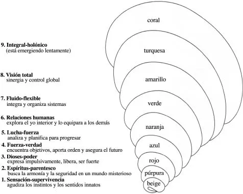 La espiral del desarrollo. Adaptado con permiso de Don Beck y Chris Cowan. Spiral Dynamics: Mastering Values, Leadership, and Change (Cambridge.: M ass.: Blackwell Publishers, 1995).