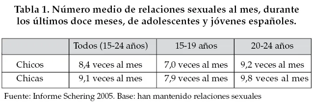 En segundo lugar, si bien con la edad aumenta la frecuencia de las relaciones sexuales, no hay una gran diferencia entre quienes tienen menos de 19 años y los mayores de esa edad. En los adolescentes de 15 a 19 años, la cifra de una media de 7,0 relaciones sexuales al mes, en los chicos, y de 7,9 en las chicas, nos habla de un frecuencia superior a la semanal, lo que indica que estamos hablando de relaciones sexuales que no se circunscriben al ámbito del ocio del fin de semana.