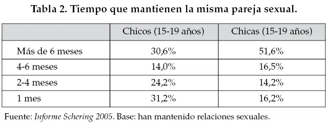 Nos preguntamos ahora por el tiempo que mantienen la misma pareja sexual. Nos limitamos en la tabla 2, dado el objeto de este trabajo y para no cargar la tabla con demasiadas cifras, a los adolescentes de 15 a 19 años, aunque distinguimos si se trata de chicos o chicas
