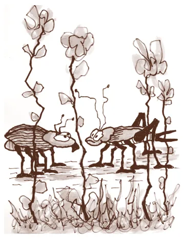 Ai va el grillito, brincando otra vez, rumbo al zacatal a buscar al tal Fidedino Sincopado pa que le entregara el serrucho. Llegando allá, empezó a gritar:
