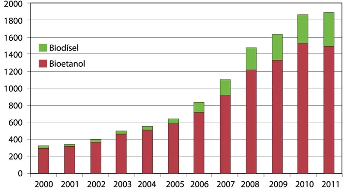 La utilización de productos líquidos derivados de la biomasa como combustibles en motores de combustión interna no es algo nuevo. Ya se comentó que el primer vehículo dísel utilizaba aceite de maní, y el etanol se ha mezclado con la gasolina casi desde los inicios del desarrollo de los vehículos que la utilizaban como carburante. Sin embargo, por las razones que se han explicado, asistimos desde hace aproximadamente una década a un gran incremento de la demanda de biocarburantes, concentrada en tres distintas regiones del planeta: la Unión Europea, los Estados Unidos y Brasil, una tendencia imitada por razones de conveniencia económica por otros países. Como se observa en la Figura IV.1, la producción mundial de bioetanol se ha multiplicado por cinco desde el año 2000, mientras que la de biodísel lo ha hecho por 25, aunque el mercado de biocombustibles sigue dominado por el bioetanol, cuyos dos principales productores son Brasil y los Estados Unidos. La producción total de ambos biocombustibles alcanza ya cifras considerables, y aunque aún es muy inferior a la del petróleo convencional, supone ya un porcentaje significativo de la producción mundial de este último.