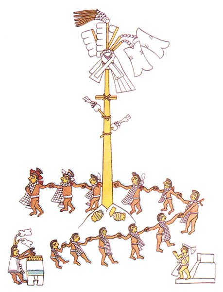 Cuando terminaban todas las otras ceremonias que se hacían en este mes llamado “Xocotlhuetzi”, corría la gente a la plaza, en donde estaba el árbol enhiesto, y a su pie estaban los jefes de los jóvenes defendiendo la subida, para que no se adelantaran unos a otros, y a golpes impedían que los más audaces tomaran ventaja a sus compañeros; pero, cuando se daba la señal de que podía comenzar el juego, todos los jóvenes se lanzaban a una, y por las cuerdas trataban de subir y llegar a la parte más alta en donde estaba la estatua del dios hecha de semilla de amaranto.