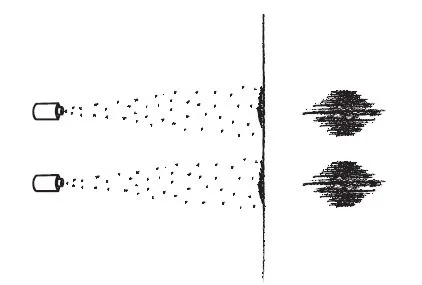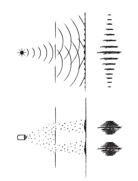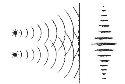 Una onda es un objeto extendido que puede cubrir una región relativamente grande del espacio y pasar simultáneamente por varios lugares; una partícula, en cambio, es un objeto compacto, localizado y que sólo puede estar en un sitio a la vez. Las ondas tienen la importante propiedad de interferir unas con otras cuando se superponen, es decir se suman y restan. Cuando dos ondas luminosas llegan a una pantalla desde fuentes distintas, producen lo que se llama un patrón de interferencia, que es una sucesión alternada de franjas brillantes y oscuras:[46] donde coinciden una cresta con otra o un valle con otro, éstos se suman, pero donde coinciden una cresta y un valle, los dos se cancelan mutuamente (figura VII.2). Este comportamiento es por completo distinto del de las partículas: éstas sólo pueden sumarse y amontonarse unas sobre otras sin presentar ninguna interferencia (figura VII.3).