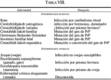 En la Tabla VIII aparece una lista de las enfermedades que actualmente se consideran debidas a la infección por priones; también se señalan otros 4 padecimientos igualmente causados por priones pero no por infección sino por nutrición, o bien por mecanismo desconocido.