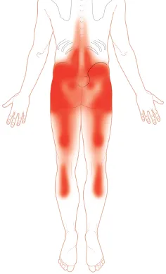 Figura 1.1: Mapa (posible) del dolor de John F. Kennedy. Erector inferior de la columna bilateral, glúteo mayor, menor o mínimo y medio a ambos lados; tensor de la fascia lata a ambos lados; gastrocnemio a ambos lados.